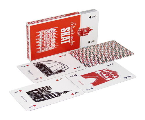 Die Motive des Stralsunder Skat zeigen Stralsunder Sehenswürdigkeiten. Abgebildet sind Nikolaikirche, Hafenspeicher, Kütertor, Johanniskloster, Ozeaneum, Wulflamhaus, Marienkirche, Lotsenhaus, Kniepertor, Jakobikirche, Rathaus, Alte Spielkartenfabrik. Die Grafiken wurden in Linol geschnitten und das Blatt im Hochdruck am Original Heidelberg Zylinder gedruckt.